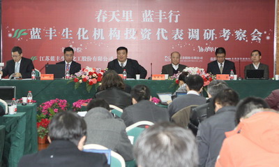 ????????為了使機(jī)構(gòu)投資者更深刻直觀地了解和認(rèn)識(shí)藍(lán)豐生化,2月22日藍(lán)豐生化舉行了“春天里,藍(lán)豐行” 機(jī)構(gòu)投資者代表實(shí)地調(diào)研活動(dòng)。藍(lán)豐生化董事長(zhǎng)楊振華、總經(jīng)理梁華中、董事會(huì)秘書、副總經(jīng)理陳康和財(cái)務(wù)總監(jiān)熊軍、集團(tuán)總經(jīng)濟(jì)師熊炬和二十多家機(jī)構(gòu)投資代表30余人參加了此次活動(dòng),大家暢談公司發(fā)展戰(zhàn)略,公司領(lǐng)導(dǎo)就大家關(guān)心的問(wèn)題作了詳細(xì)解答,會(huì)議由東吳證券資本市場(chǎng)部總經(jīng)理?xiàng)顟c林主持。會(huì)后機(jī)構(gòu)投資代表實(shí)地考察公司的生產(chǎn)線,感受資本市場(chǎng)新銳、農(nóng)化新藍(lán)籌--藍(lán)豐生化強(qiáng)勁的發(fā)展態(tài)勢(shì)及公司管理層的風(fēng)采。